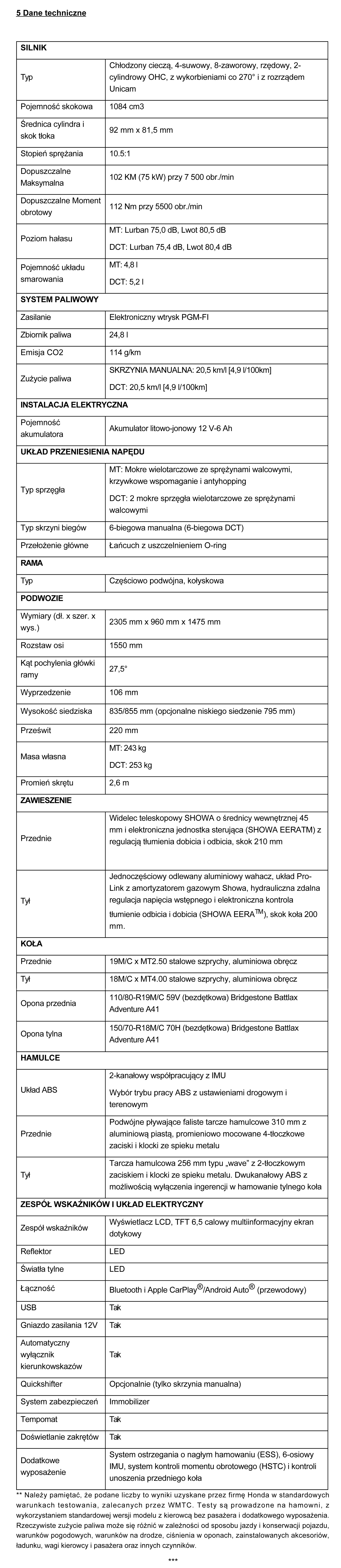 Prześwit wynosi 220 mm (30 mm mniej niż CRF1100L Africa Twin), rozstaw osi 1550 mm, kąt pochylenia główki ramy, to 27,5°, wyprzedzenie wynosi 106 mm. (wcześniej 1574 mm/27,5°/113 mm). Masa motocykla z płynami wynosi 243 kg (253 kg dla wersji DCT)